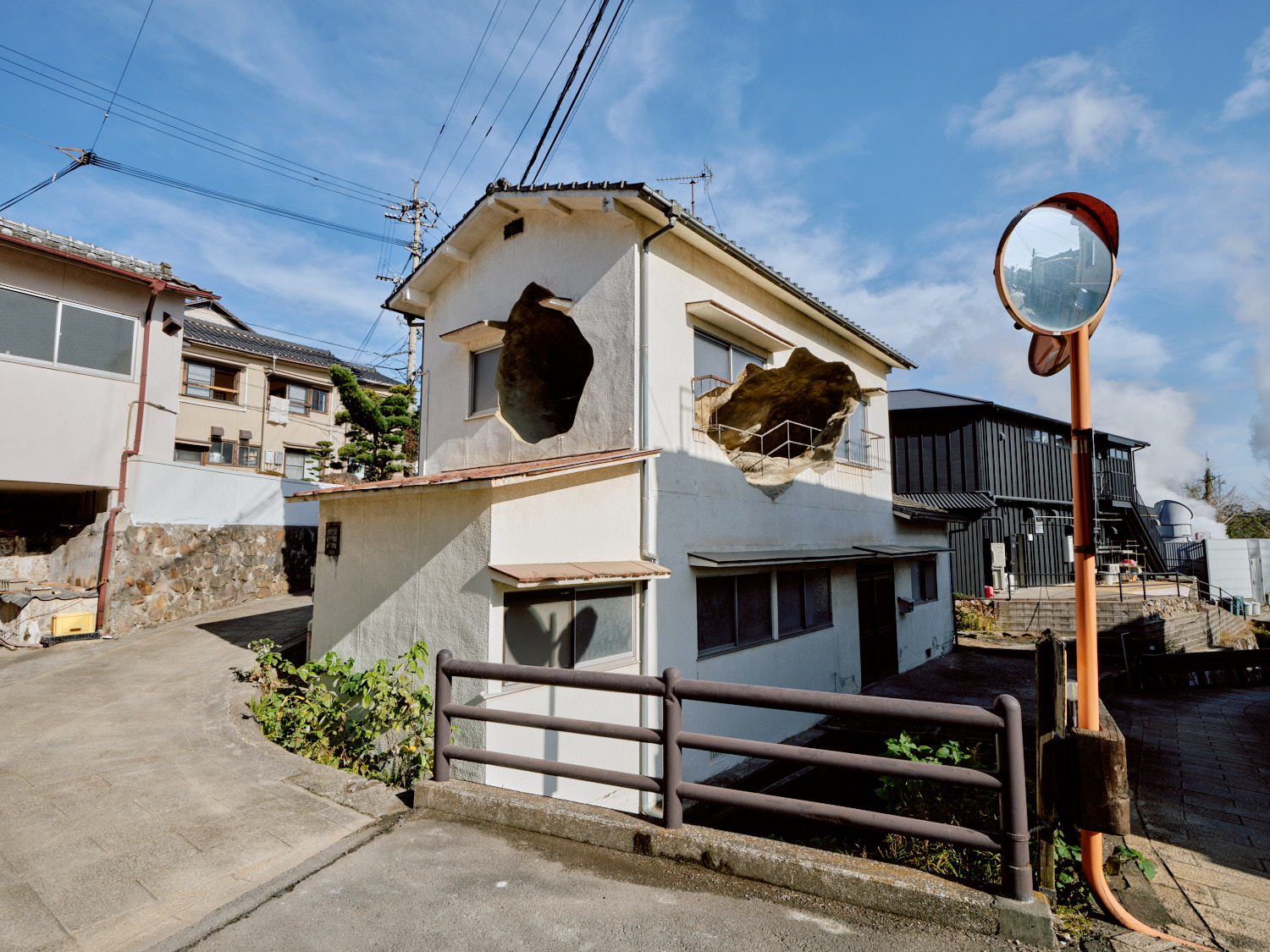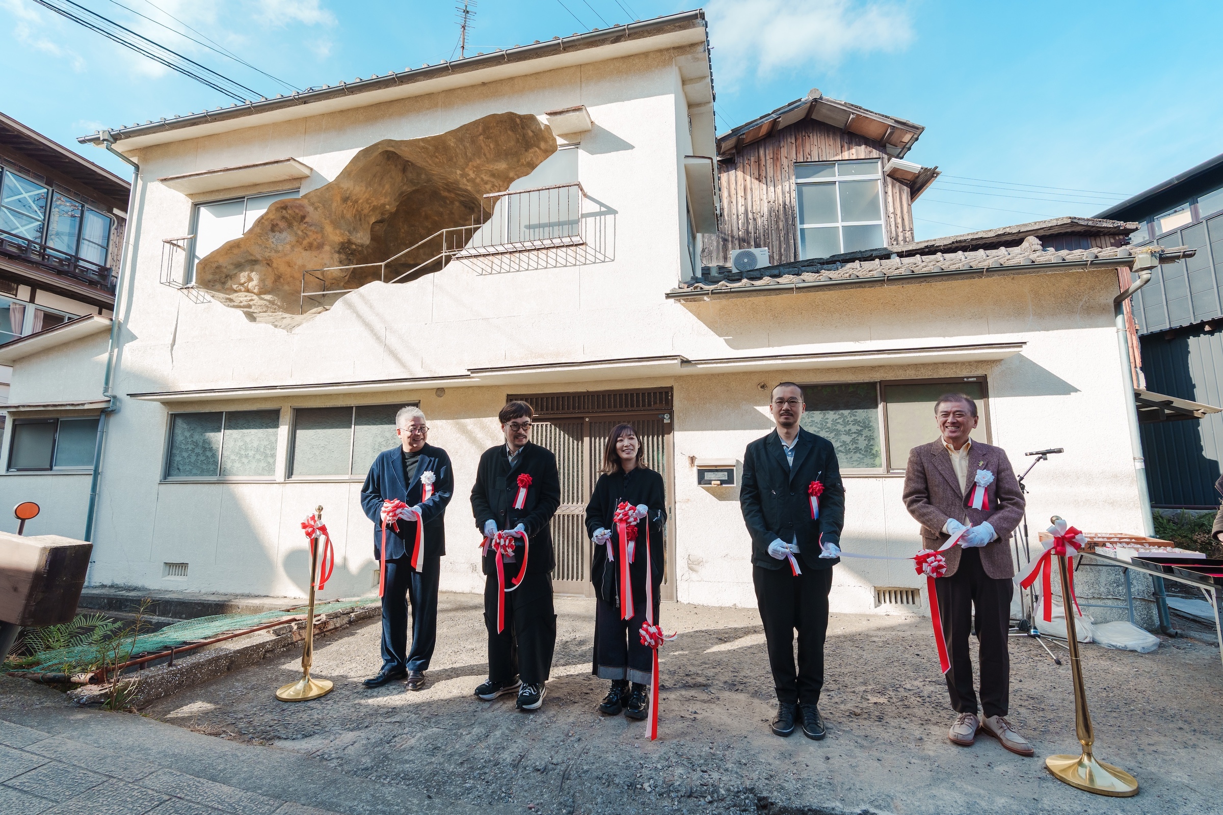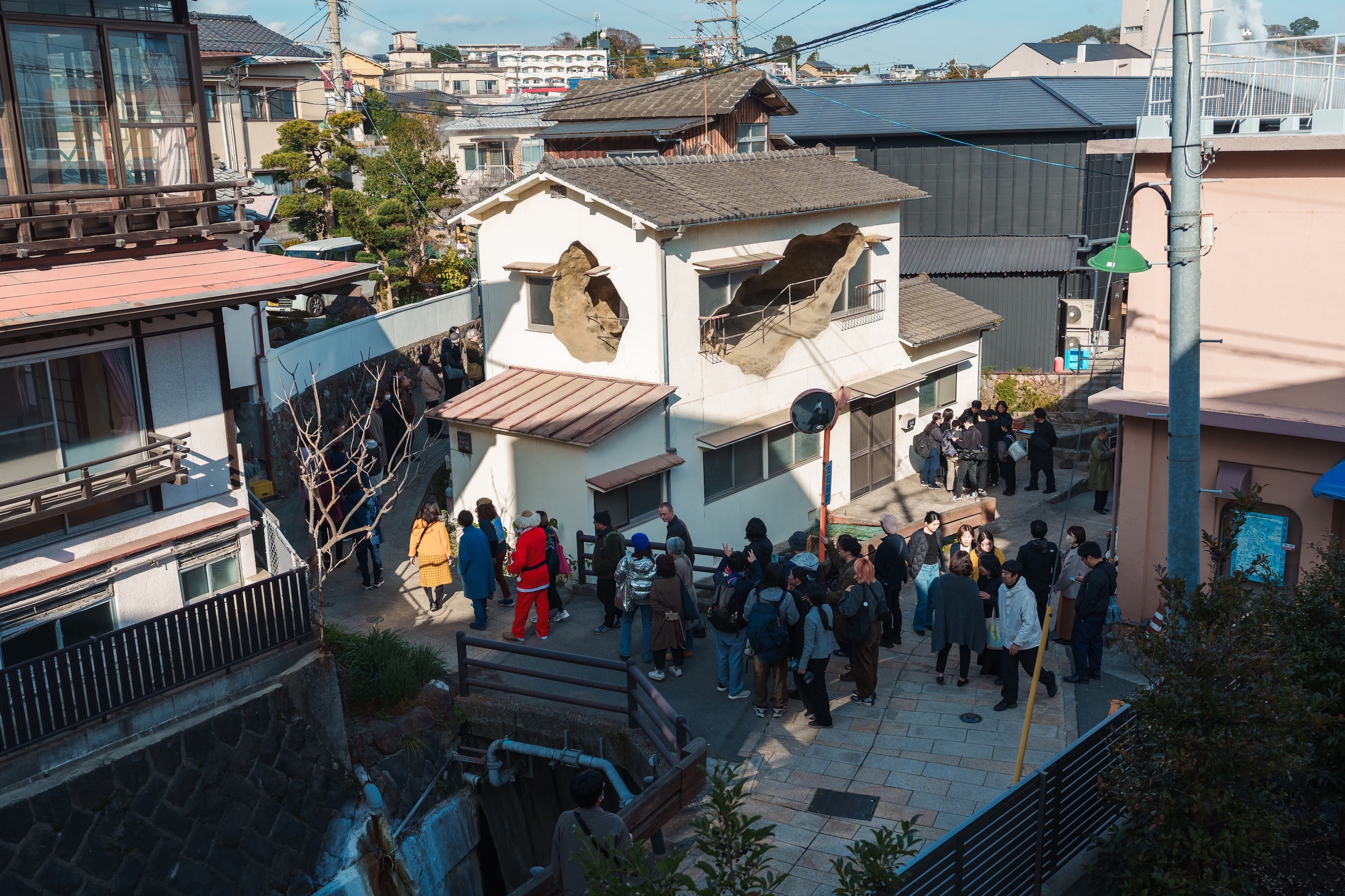 別府市・鉄輪の民家を大胆に用いた本作は、見る者に視覚的な驚きをもたらすとともに、この土地の成り立ちや世界の不思議に、ふと想いを巡らせるきっかけとなる作品です。外観を鑑賞するだけでなく、作品内部で湯けむりをぼんやり眺めたり、川の水音に身を委ねたりして過ごせば、この場所に居ながらにして、ここではない何処かへと誘われるひとときを体験できるでしょう。ぜひ、ご鑑賞ください。